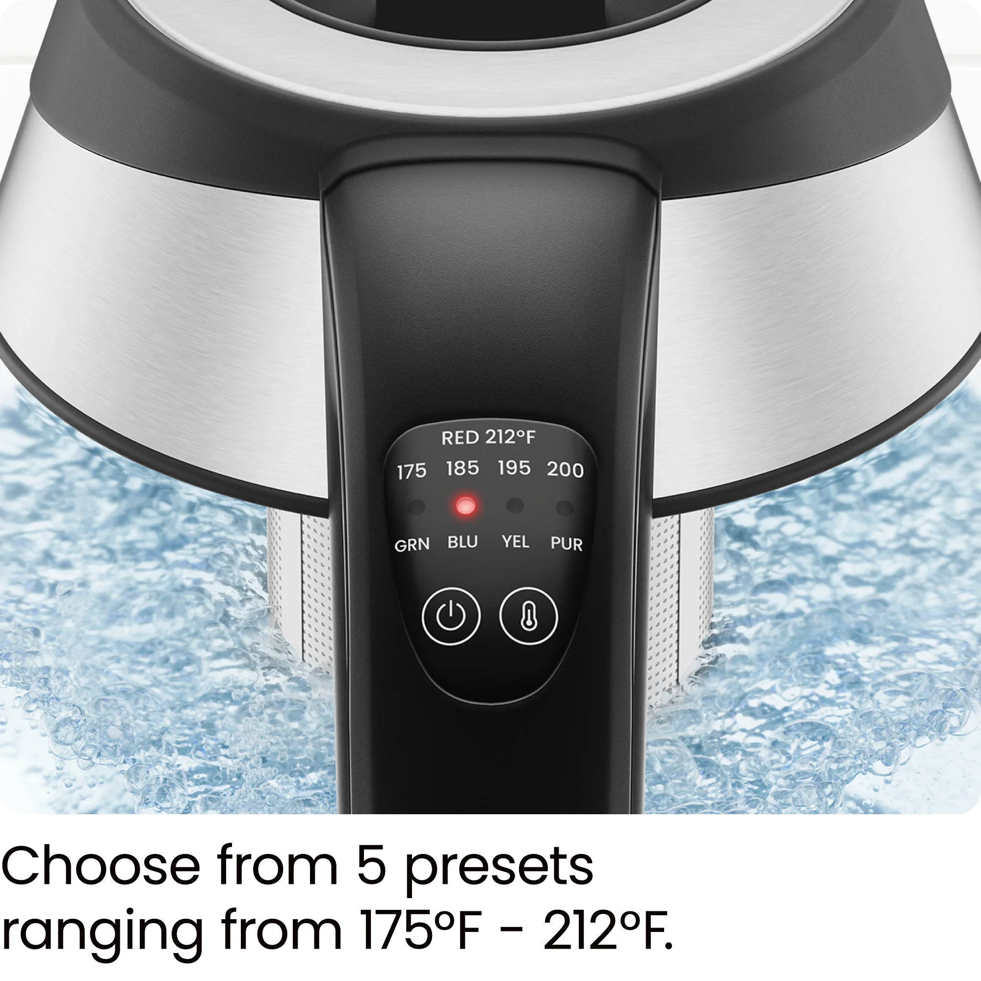 Boasting rapid boiling times and a generous 1.8-liter capacity, this sleek stainless-steel kettle offers unparalleled performance. Equipped with advanced temperature control and 5 preset options represented by vibrant LED lights, it ensures precision brewing for various beverages. From green tea to French press coffee, its versatility knows no bounds, maintaining desired temperatures for up to 60 minutes. Safety features like a stay-cool handle and automatic shut-off guarantee peace of mind, while the included tea infuser enhances brewing convenience. Elevate your kitchen experience with the ultimate combination of style, functionality, and safety.