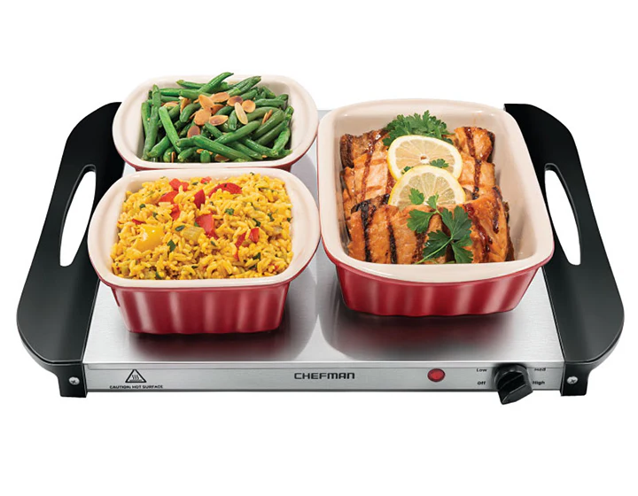 BUFFET SERVERS INCLUDED: Three stainless-steel warming pans are included; two 1.2 Qt warming pans and one 2.5 Qt warming pan. The 3 high dome transparent lids keep the heat in. Accessories are dishwasher safe for easy clean up.